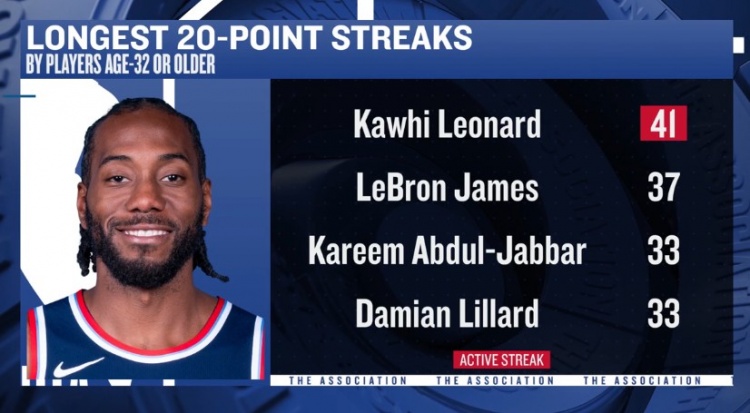 开云体育-32岁后连续20+榜:伦纳德41场居首 詹姆斯37场第2 利拉德33场第3